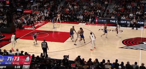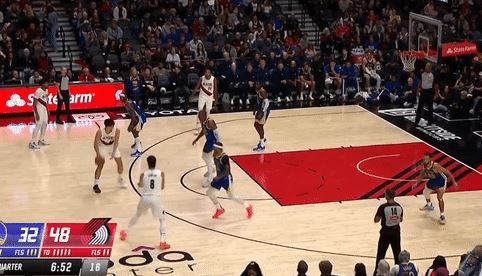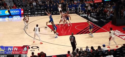 第三节开拓者卡莱布-乐福拿下6分,勇士斯蒂芬-库里拿下13分,第三节结束开拓者87-91落后勇士