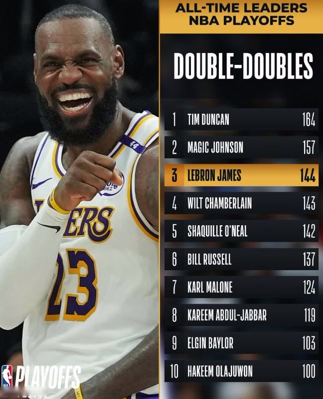 詹姆斯季后赛两双数达144个&盖帽达284次,升至历史第三和第九