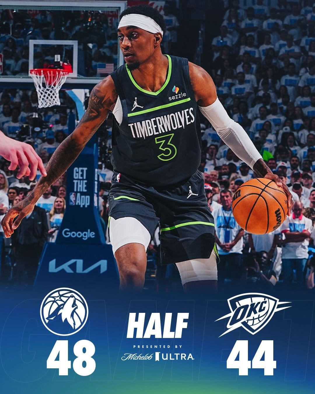 北京时间今日,在西部决赛G1中,半场战罢森林狼48-44暂时领先雷霆。