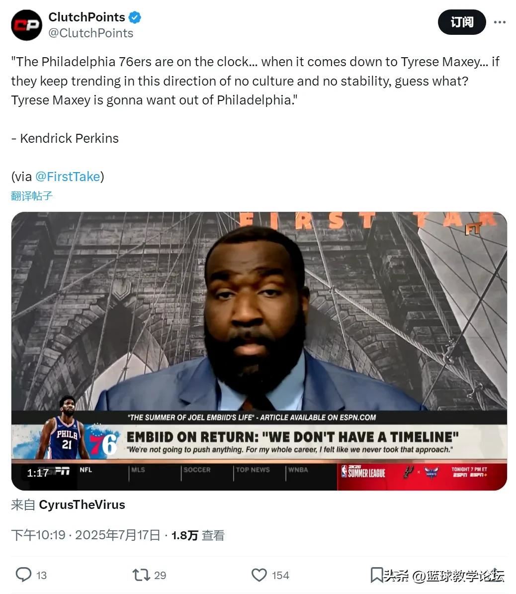 ESPN评论员帕金斯则表示:“76人现在正处在危急关头,尤其是在马克西的问题上。 如果球队朝着缺乏稳定性的方向发展下去,马克西很快就会申请交易。 ”上赛季球员内部会议,马克西当着全队的面,批评恩比德训练总是迟到。