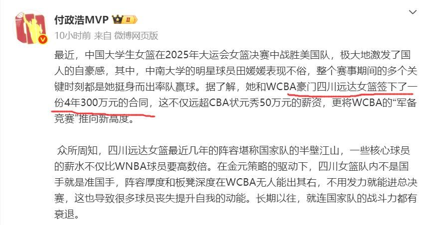 像WNBA这种世界第一联赛,球员的平均年薪也只是勉强达到10万美元,而新人的年薪就更加少得可怜了,即便是作为WNBA的状元秀,他们第一年的年薪也不足8万美元。如果按照这个计算的话,WNBA状元秀的年薪其实只有不到60万元。而田媛媛呢?在与四川队签下四年300万合同后,这也就意味着,她的平均年薪已经达到75万元,已经超过了WNBA状元秀的年薪了。