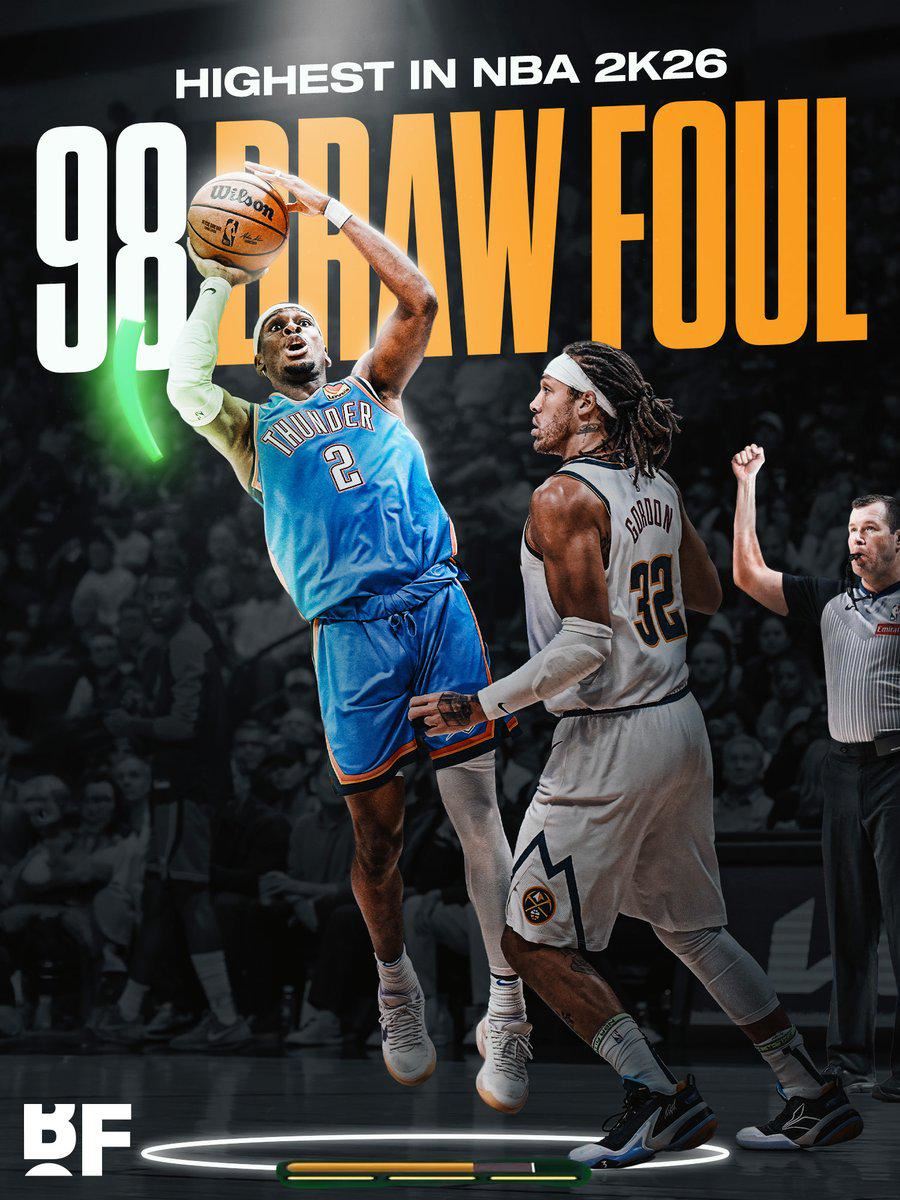 其中,雷霆队当家球星、新科MVP&FMVP亚历山大的造犯规能力值高达98分,排名游戏中所有球员的第一位。