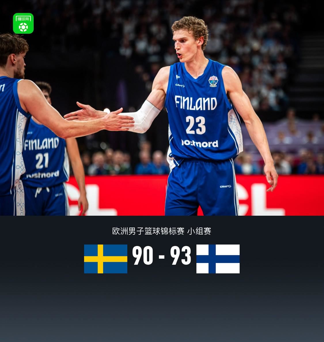 第四节瑞典男篮加多艾福斯拿下8分,芬兰男篮马尔卡宁拿下5分,最终瑞典男篮90-93不敌芬兰男篮