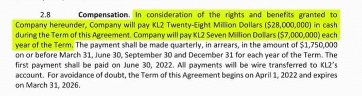Pablo Torre还公示了一份合同截图,该合同的2.8条款显示,鉴于本公司可以从中获得权利和利益,我们将在本合同期限内,每年向KL2支付700万美元,共累计支付2800万美元。