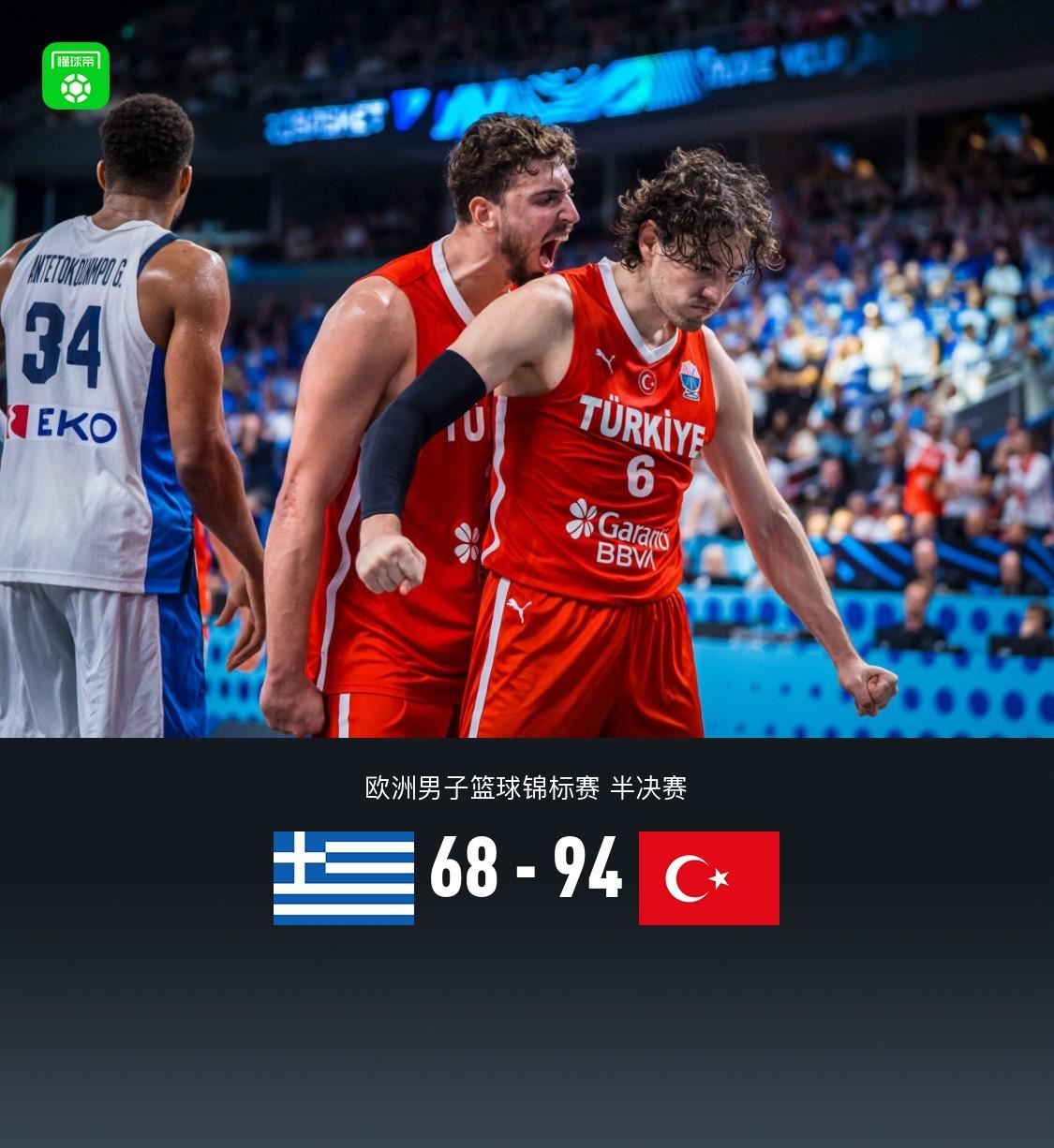 土耳其94-68大胜希腊晋级欧锦赛决赛,申京15+12+6,字母哥12+12