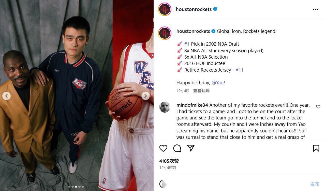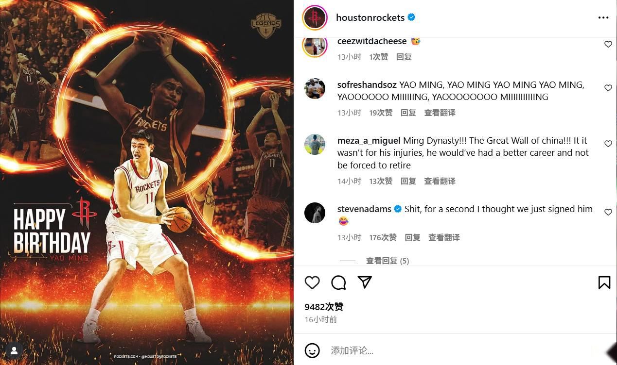 火箭队为姚明发布了两条社媒,分别晒出了姚明的生日海报,并发布了他的生涯荣誉。火箭队的中锋史蒂文-亚当斯在姚明的生日海报下留言写道:“我去,有那么一瞬间我还以为我们刚签下了他”