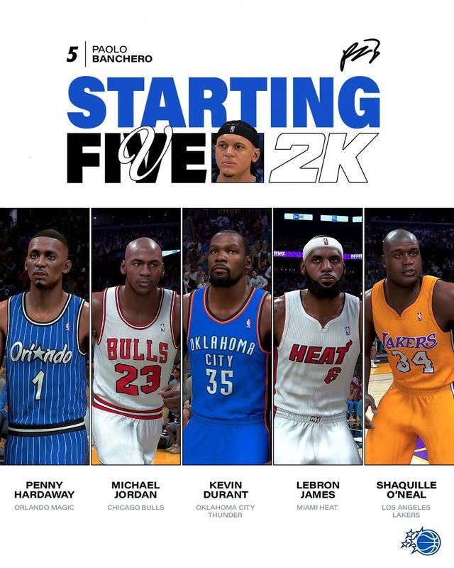 魔术队官方Instagram列出班凯罗的选择,他的2K首发五人组分别是:“便士”哈达威、迈克尔-乔丹、凯文-杜兰特、勒布朗-詹姆斯和沙奎尔-奥尼尔。