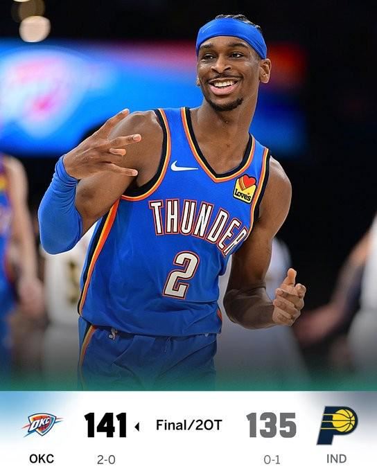 北京时间今日,在NBA常规赛中,雷霆队历经双加时以141-135击败了步行者队,取得了开季两连胜。
