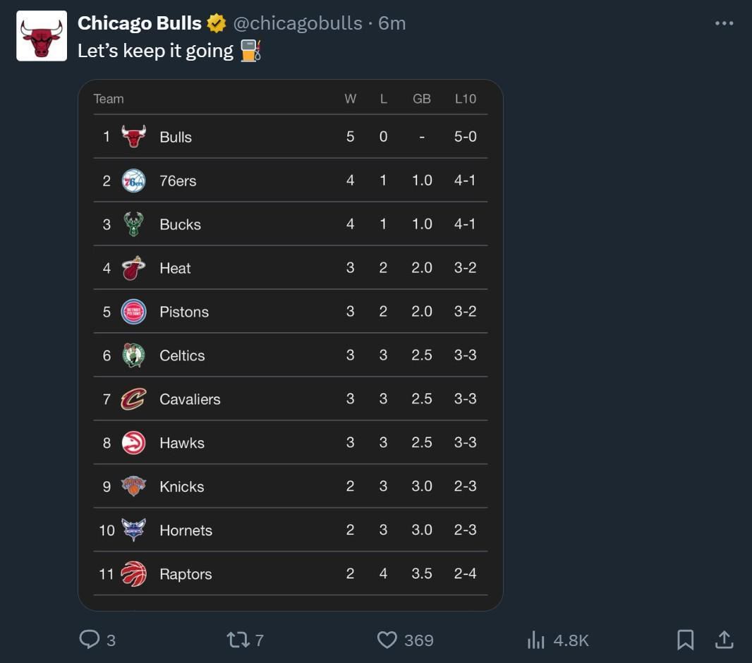 公牛队官方在赛后也晒出海报庆祝这一成就,并晒出目前的东部排行榜。