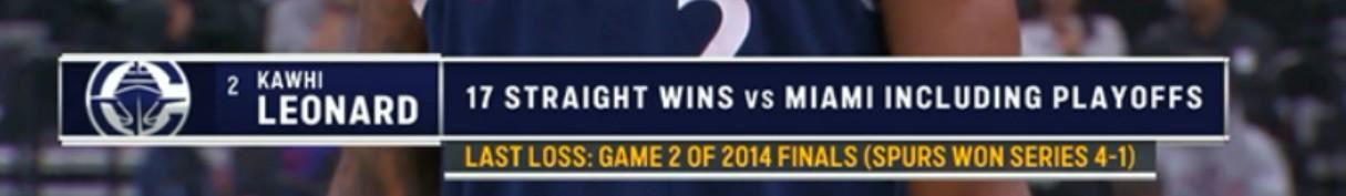 据统计,这是伦纳德11年来首次负于热火队,上一次伦纳德所效力的球队输给热火还要追溯到2014年总决赛G2,在那场比赛中詹韦波三巨头领衔的热火击败了马刺,将系列赛比分扳为1-1。在那之后,伦纳德对阵热火取得了17连胜。