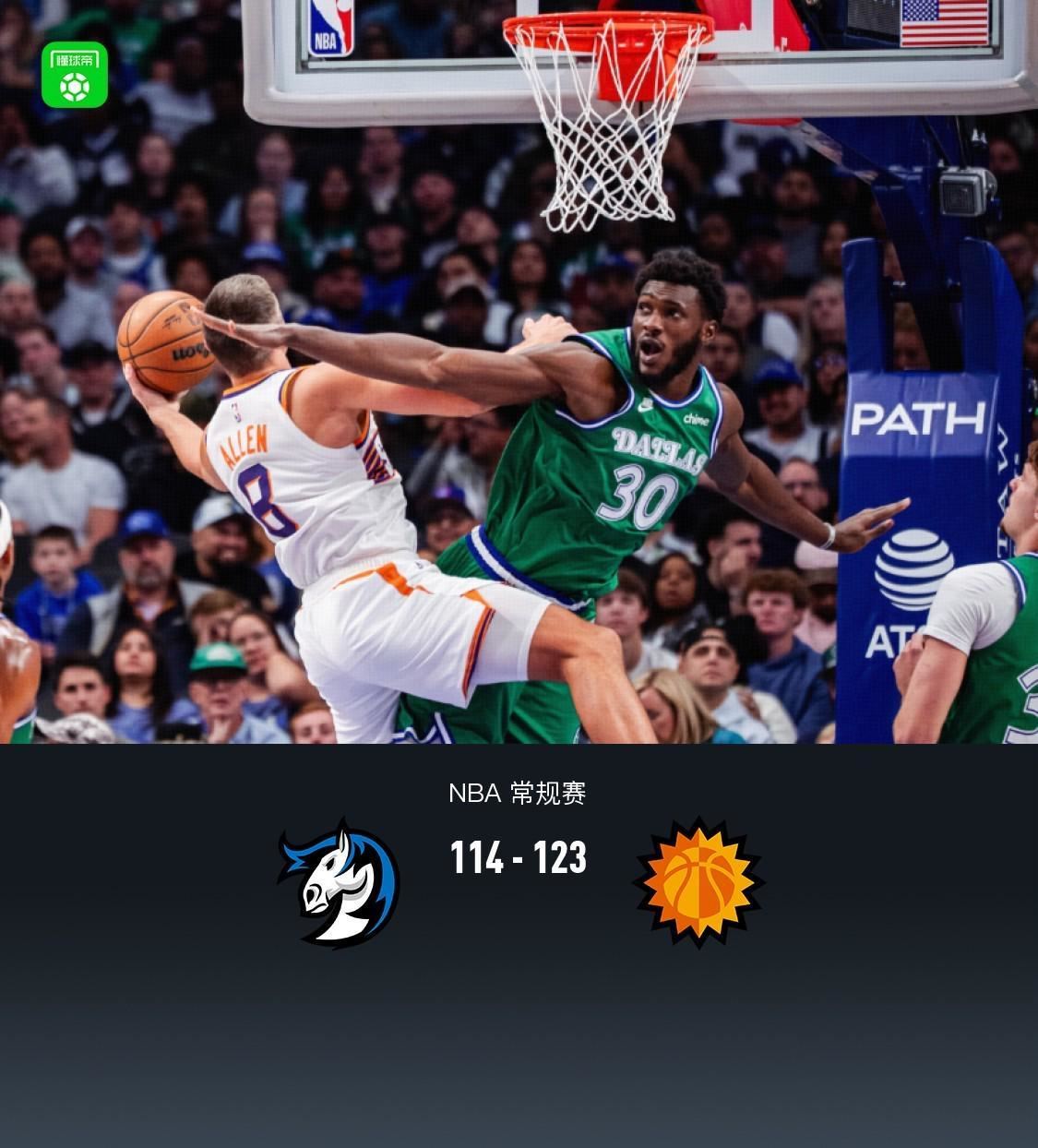 第四节独行侠克莱-汤普森拿下9分,太阳格雷森-阿伦拿下13分,最终独行侠114-123不敌太阳