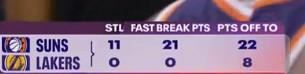 本场比赛,湖人队整体活力不足。在第三节结束时的一个数据统计中,湖人队本场比赛还没有完成过一次抢断,同时快攻得分也为0;反观太阳队拿到了11次抢断,并通过快攻得到了21分。此外,利用对手失误得分方面,湖人队依然以8-22落后。