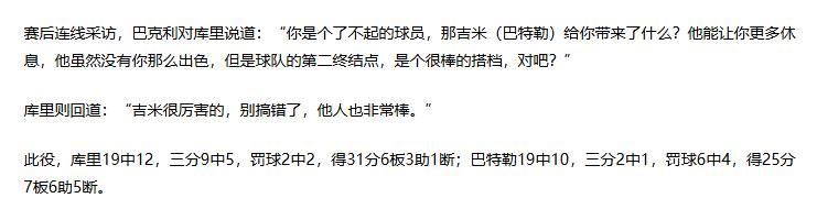 当然,库里的球商同样很高,赛后巴克利想要分裂两人的关系,库里力挺巴特勒,表示:“吉米很厉害的,别搞错了,他人也非常棒。”