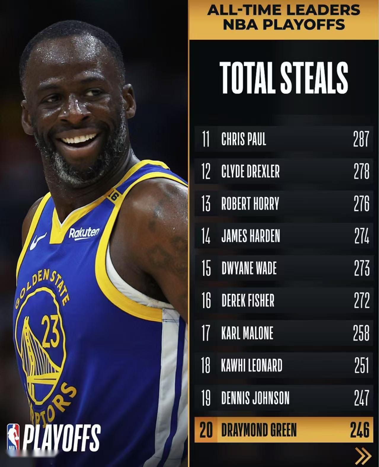 德雷蒙德-格林生涯季后赛抢断数达到246个,超越火箭名宿奥拉朱旺(245)排名历史第20位!