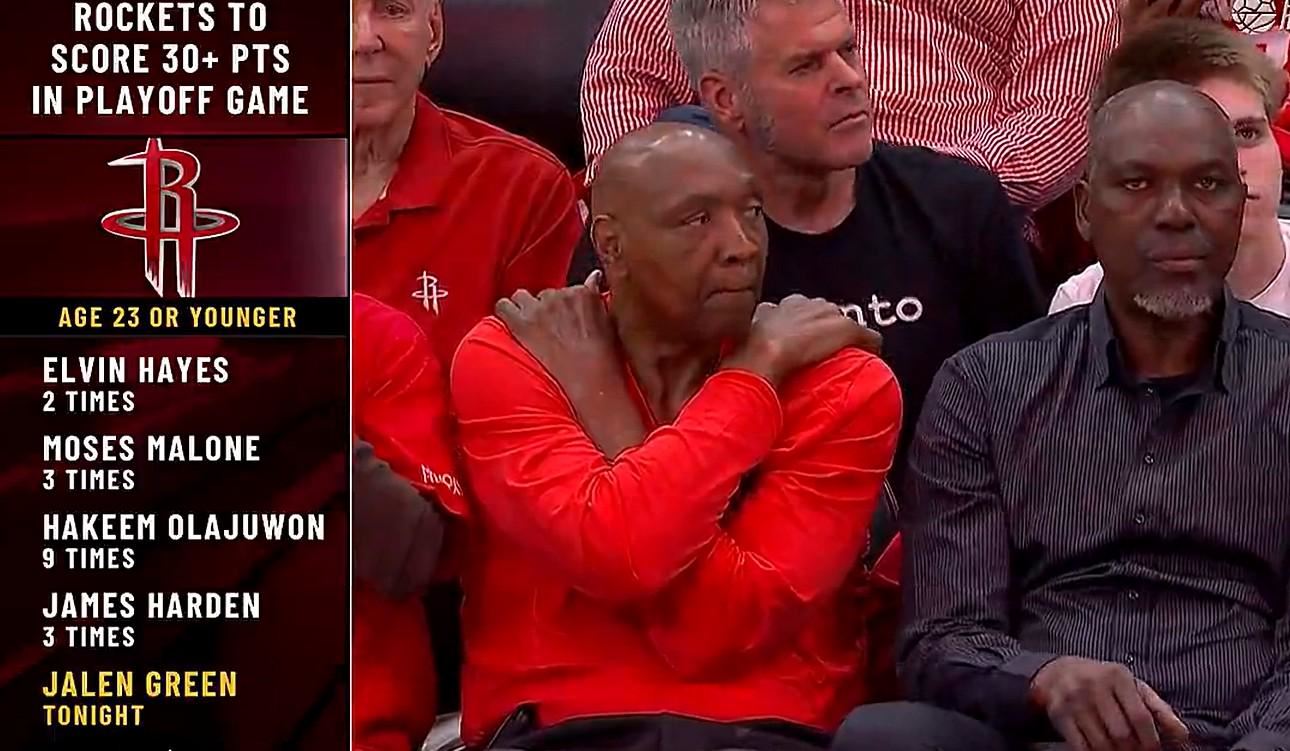 本场比赛杰伦-格林已经拿下30分,根据转播方提供的数据,杰伦-格林成功跻身火箭队史23岁以下球员季后赛单场30+得分榜单。