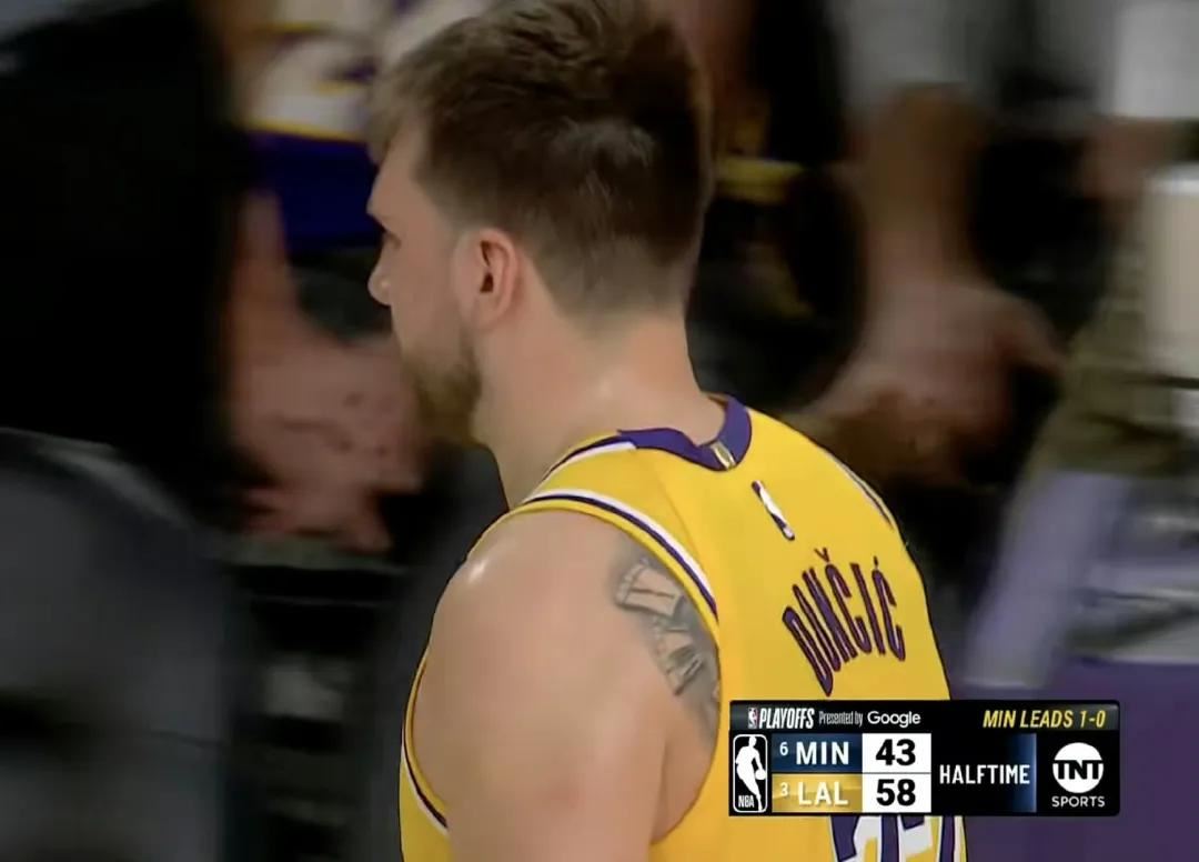 半场打完东契奇10中6拿到22分5篮板5助攻,他比肩科比、浓眉成为湖人季后赛第三位半场20+5+5的球员。