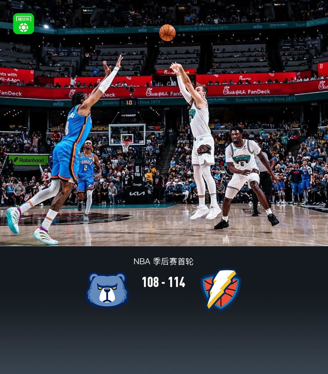 第四节灰熊小贾伦-杰克逊拿下4分,雷霆亚历山大拿下8分,最终灰熊108-114不敌雷霆