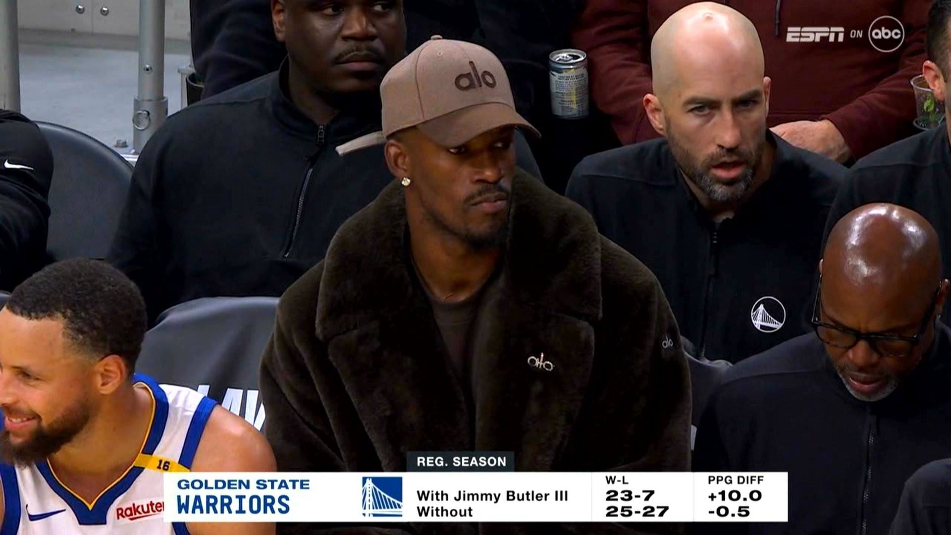 赛后,库里接受采访时谈到了巴特勒这件大衣,他调侃道:“坐在他旁边我都不需要热敷了。”