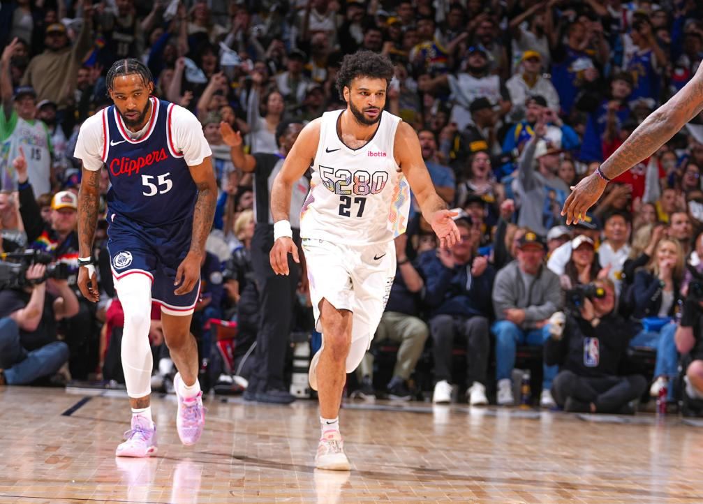 哈登飞身上篮止血后,突破继续造犯规,穆雷弹无虚发,当鲍威尔回应三分时,约基奇和波特继续守住10分领先。后半段约基奇补篮+威少拉杆上篮,此后威少继续跳投,第一节掘金35-23领先快船。进入第二节,祖巴茨勾手+博格丹速射三分球,威少和穆雷内突外投,威少手感火热,快船只剩博格丹和伦纳德勉强维持局面。中段威少和穆雷继续猛攻,博格丹打到戈登脸部吃到进攻犯规,危急时刻邓恩下起三分雨,不过布莱恩和波特多点开花,快船始终追不上比分。