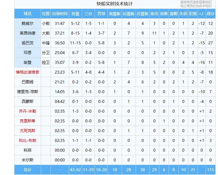 快船数据: 祖巴茨27分5板2帽、莱昂纳德20分9板11助2帽、博格达诺维奇18分3板5助、邓恩15分2助2断、鲍威尔12分4板3助、哈登11分8板5助2断、德里克-琼斯7分、巴图姆6板2助2帽。