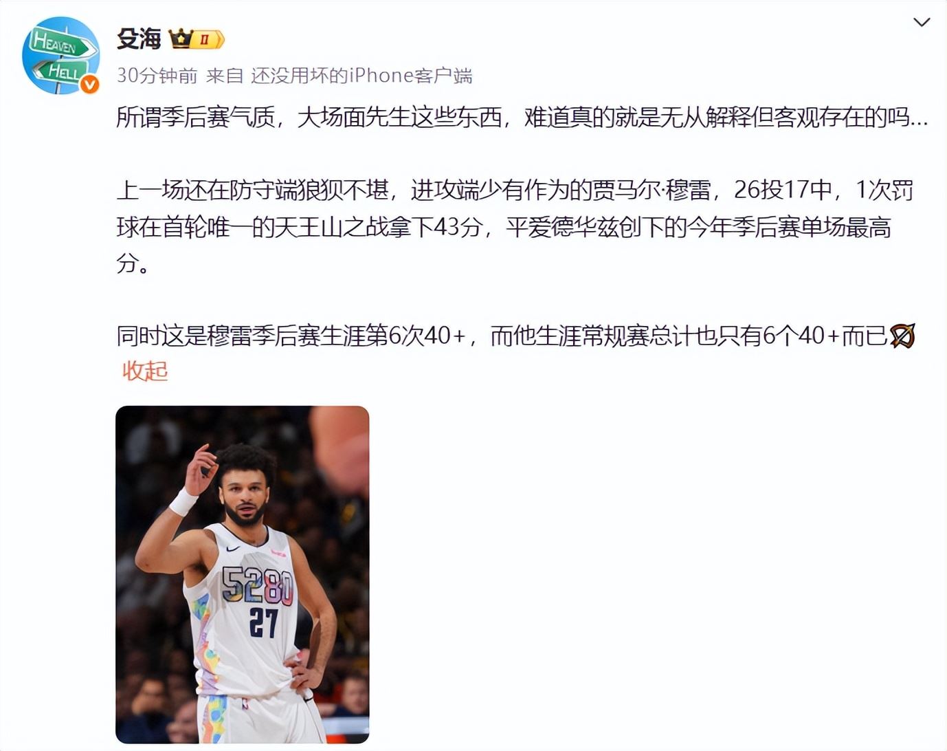 赛后,国内篮球解说殳海一针见血: 所谓季后赛气质,大场面先生这些东西,难道真的就是无从解释但客观存在的吗?上一场还在防守端狼狈不堪,进攻端少有作为的贾马尔·穆雷,此役26投17中,1次罚球在首轮唯一的天王山之战拿下43分。