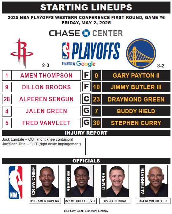 赛前,官方公布了本场比赛双方的首发阵容。勇士队方面将波杰姆斯基撤出首发,顶替入列的是小佩顿。火箭队方面则沿用了系列赛过去五场的首发阵容。