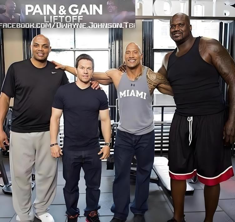 强森身高1米9,他可是一身腱子肉,在普通人里绝对算得上是虎背熊腰身材。就是身材在普通人里脱颖而出,他才能进军好莱坞,饰演那么多硬汉角色。不过当他遇到奥尼尔,这才发现自己所谓强悍肌肉,在奥尼尔身边根本不够看。哪怕跟一旁巴克利对比,强森也明显小了一号,我们眼里的壮汉,在NBA球星眼里就是小鸟依人。
