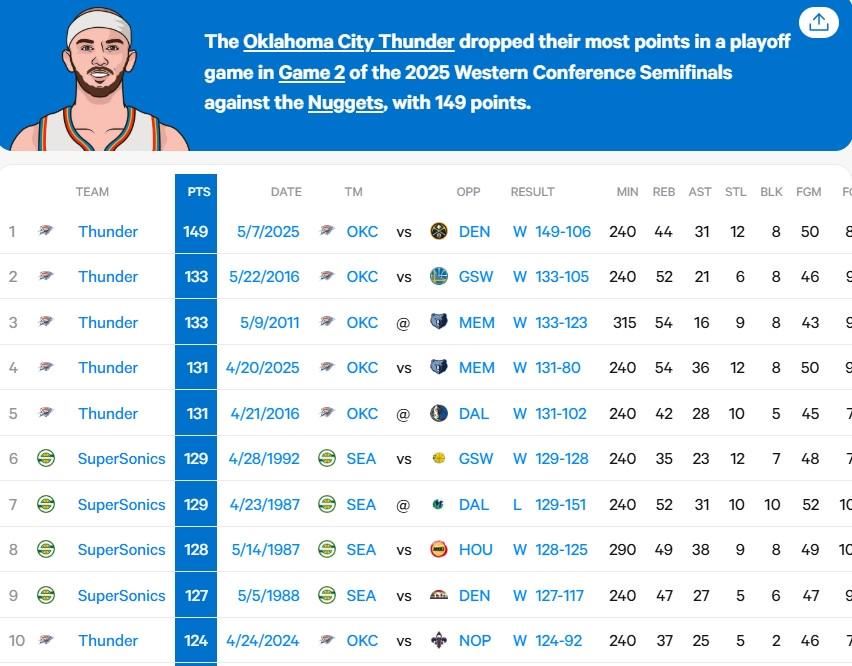 雷霆狂轰149分刷新队史季后赛得分纪录,此前是16年对勇士的133分