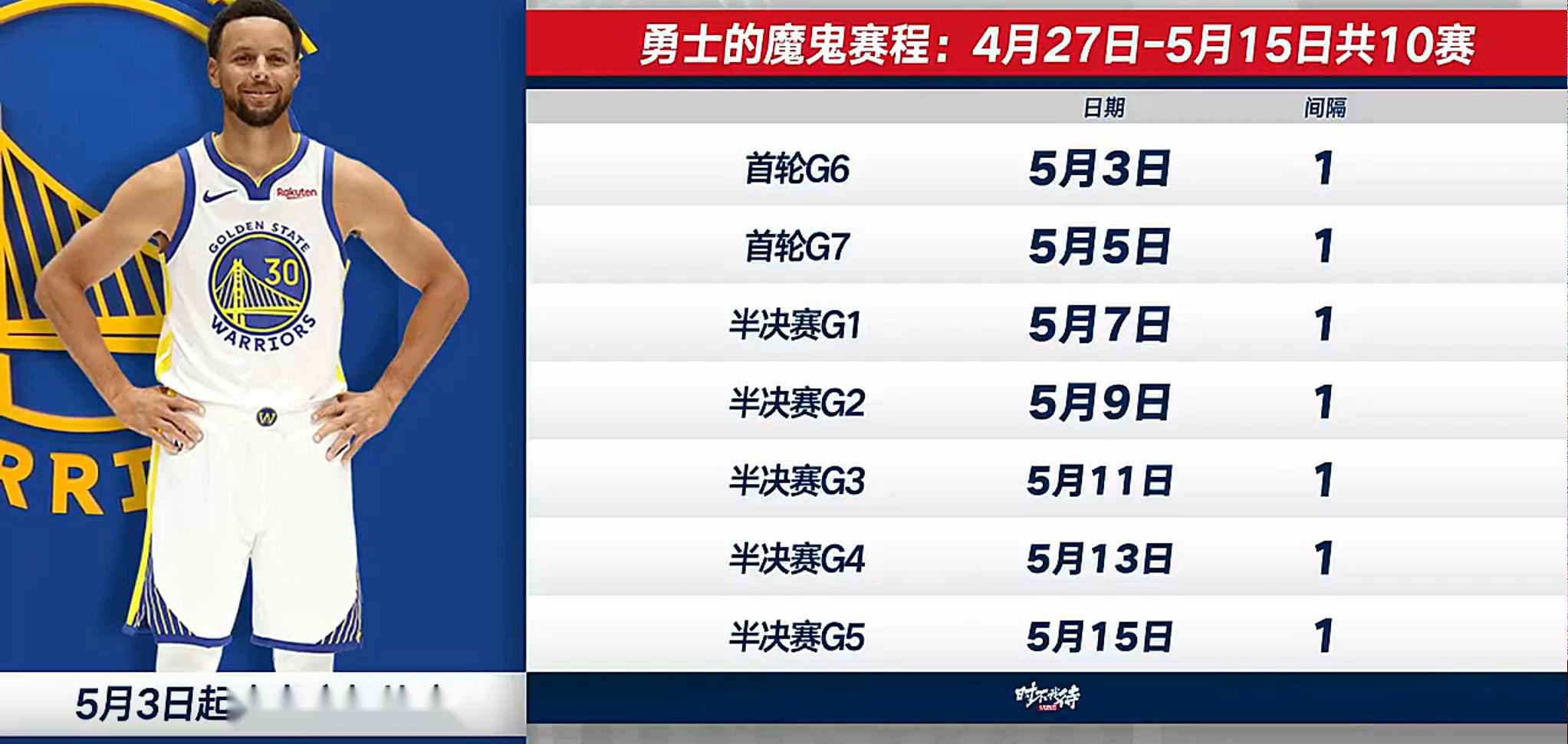 在次轮系列赛开始前,库里就在一次进攻中拉伤了左腿筋,最后确诊为1级拉伤,这也与密集的赛程和比赛的高强度不无关系。