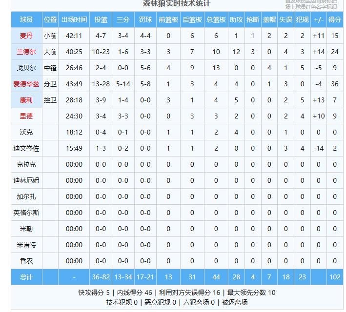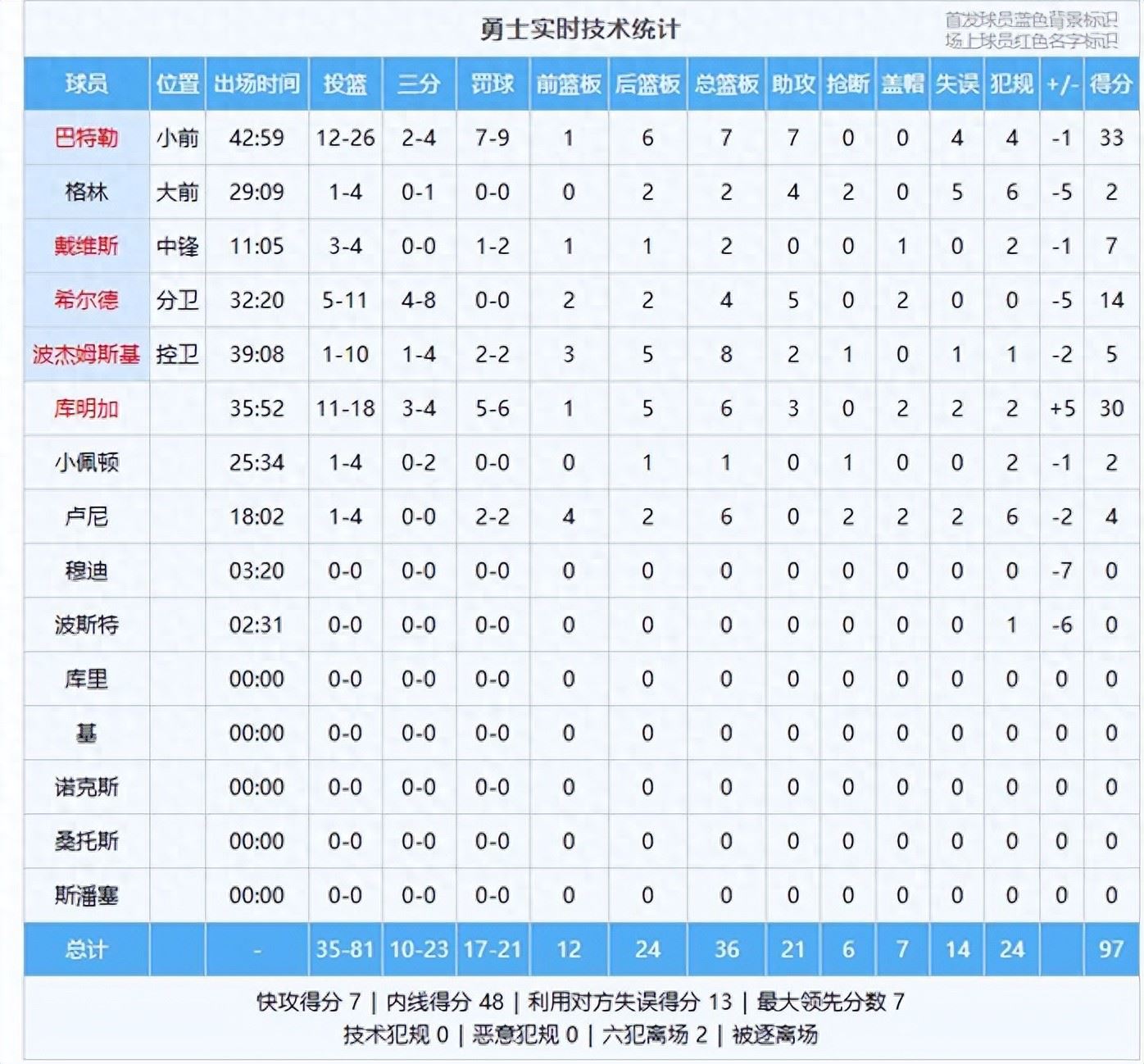 数据: 巴特勒33分7板7助、库明加30分6板3助2帽、希尔德14分4板5助2帽、戴维斯7分、波杰姆斯基5分8板2助、卢尼4分6板2断2帽、格林2分2板4助2断6犯;爱德华兹36分4板4助、兰德尔24分10板12助3断、麦丹15分6板2帽、戈贝尔9分13板4帽、里德9分3板、康利7分4板5助。