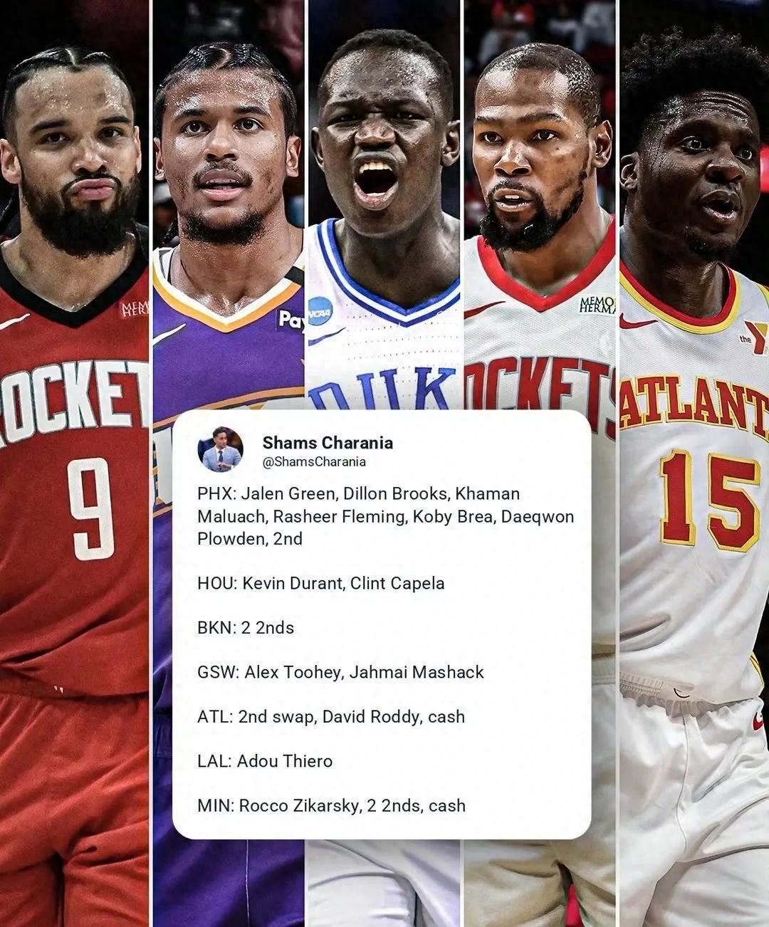 菲尼克斯得到:杰伦-格林、狄龙-布鲁克斯、卡曼-马卢阿奇、拉希尔-弗莱明、科比-布雷亚、戴奎恩-普洛登、2个次轮签;休斯敦得到:凯文-杜兰特、克林特-卡佩拉;